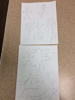 Students learn to draw various poses with stick people.